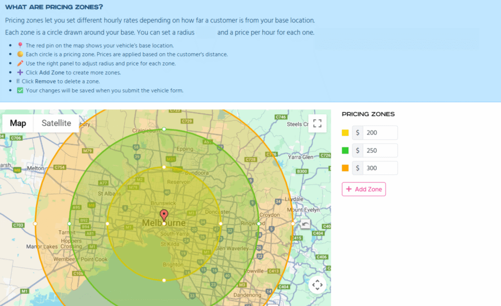 - Use distance-based zones – charge different hourly rates depending on how far the booking is from your base location.