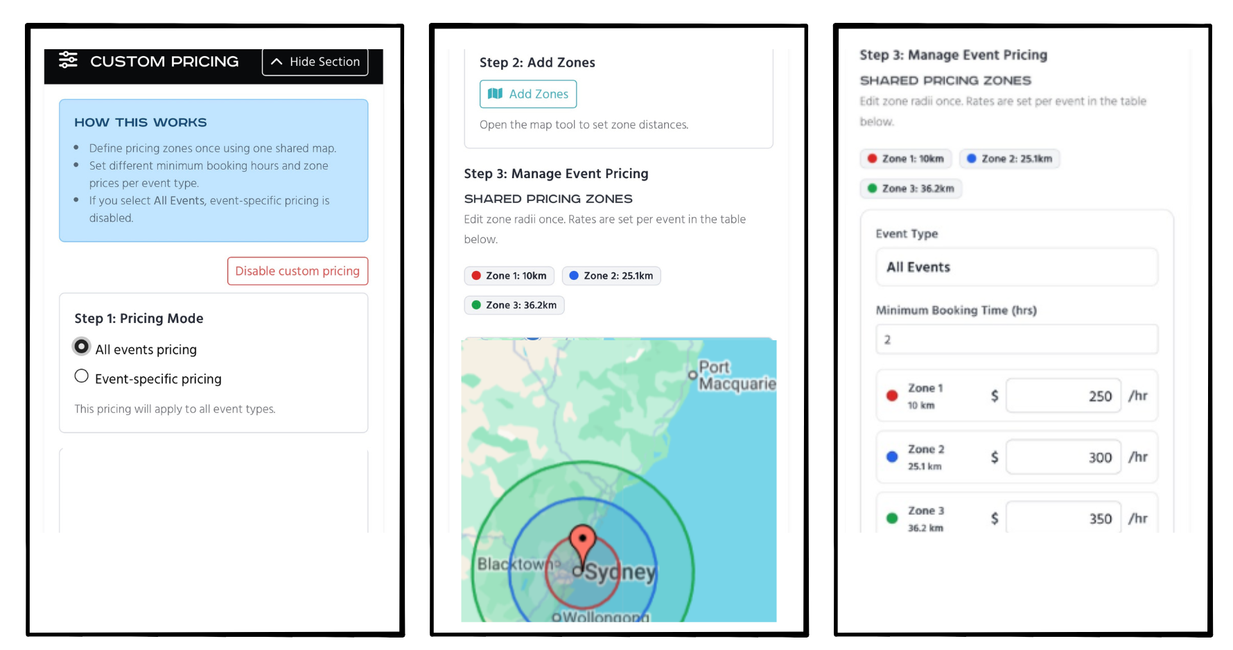But what if a customer wants to book your vehicle for a wedding 80km away, or a half-day photoshoot in another region? That’s where custom pricing becomes your best tool.