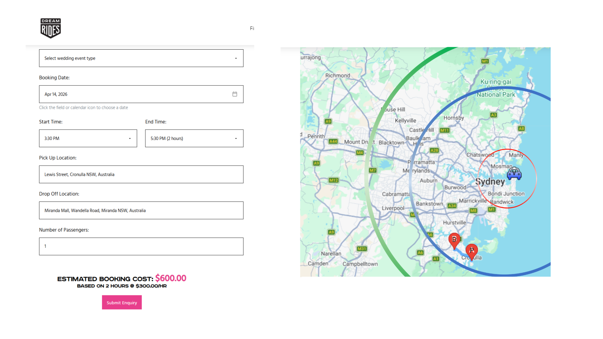 When customers browse your vehicle listing, they’ll see your base location and an automatically generated price that reflects the event type and travel distance — all based on the parameters you set when creating your listing. Before they submit a booking request, their expected price is calculated in real time using the details they’ve entered and the radius you’ve allocated as a driver, giving them full transparency upfront.
